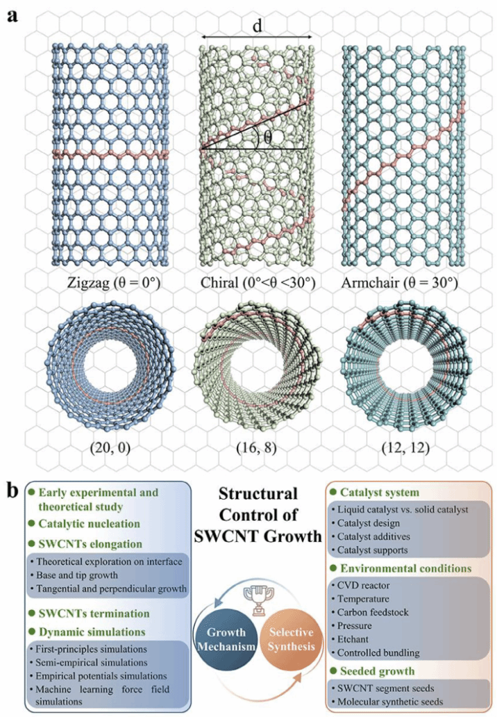 該綜述從理論與實驗緊密結合、相互促進的角度出發,全面梳理了近35年來SWCNT的生長機制及其選擇性合成的歷史脈絡和最新理論實驗進展,主要內容包括SWCNT的生長機制、SWCNT生長分子模擬、基于催化劑設計的SWCNT選擇性生長、生長環境對SWCNT選擇性生長的影響以及碳納米管克隆生長。綜述提出了SWCNT選擇性可控生長面臨的主要挑戰以及最終可行的解決方案,為未來10年SWCNT生長研究提供了方向。